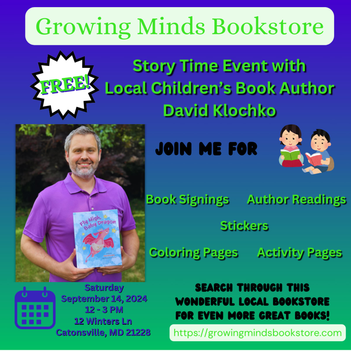 Come out to Growing Minds Bookstore for my first ever Author event with readings, free coloring pages, and books for sale!